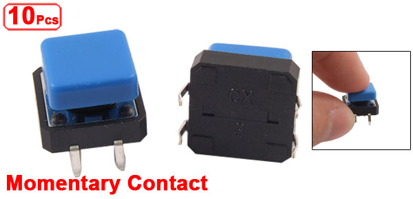 Product Name Tact Switch Contact Type Momentary Contact Dimension 12 x 12 x 12mm / 0.47" x 0.47" x 0.47" (L*W*H) Button Size 10 x 10 x 4mm/ 0.4" x 0.4" x 0.16" (L*W*H) Pin Pitch 6mm / 0.24" Pin Length 5mm / 0.2" Material Plastic, Metal, Electric Parts Color Black, Silver Tone, Blue Net Weight 10g Package Content 10 Pcs x Tact Switches - Reviews