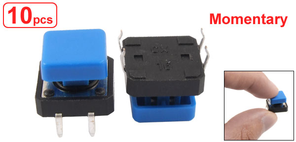 Details10 Pcs PCB Momentary Tactile Push Button Switch 12 x 12mm x 9mm 4 Pin DIP w Cap  Product Name Tact Switch Contact Type Momentary Contact Size 12 x 12 x 9mm/0.47" x 0.47" x 0.35" (L*W*H) Button Size 10 x 10mm/0.39'' x 0.39'' (L*W) Pin Pitch 12.5 x 4.5mm/0.49'' x 0.18'' (L*W) Pin Length 4.5mm/0.18'' Material Plastic, Metal, Electric Parts Color Black, Blue Net Weight 10g Package Content 10 x Tact Switches