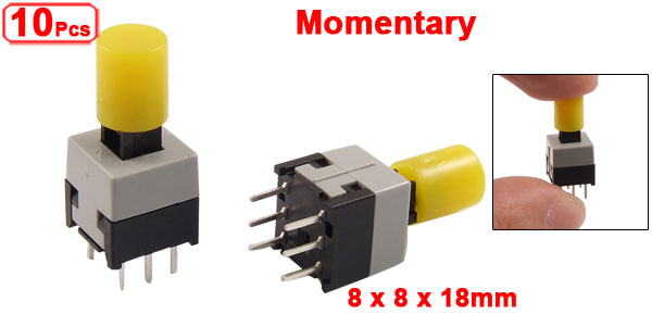 Product Name Tact Switch Contact Type Momentary Dimension 8 x 8 x 18mm / 0.31" x 0.31" x 0.71" (L*W*H) Button Cap Size 6 x 7mm / 0.24" x 0.27"(D*H) Pin Pitch 6 x 2mm / 0.24" x 0.08" (L*W) Pin Length 4mm / 0.16" Material Plastic, Metal, Electric Parts Color Yellow, Gray, Black Net Weight 9g Package Content 10 x Tact Switch w Cap - Reviews