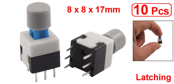 Product Name Tact Switch Contact Type Latching Dimension 8 x 8 x 17mm / 0.31" x 0.31" x 0.67" (L*W*H) Button Cap Size 6 x 5mm / 0.23" x 0.2"(D*H) Pin Pitch 5.5 x 2.5mm / 0.22" x 0.1" (L*W) Pin Length 4mm / 0.16" Material Plastic, Metal, Electric Parts Color Black, Gray, White, Blue Net Weight 8g Package Content 10 x Tact Switch w Cap - Reviews
