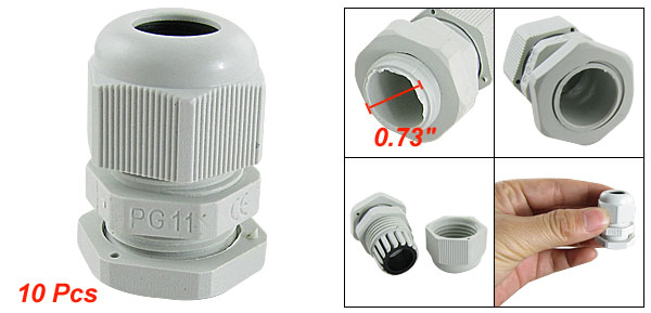 Product Name Cable Gland Model PG11 Degree of Protection IP67 (Water Proof) Cable Range 5-10mm / 0.19"- 0.39" Thread O.D. 18.6mm / 0.73“ Thread Length 9mm / 0.35” Total Size 23 x 35mm / 0.9" x 1.4" (D*H) Material Plastic Color White Weight 87g Package Content 10 x Cable Gland - Reviews