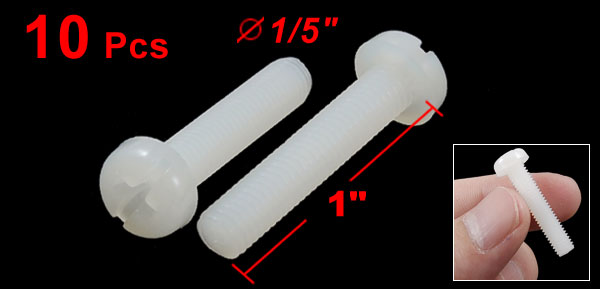Product Name Screw Type Round Phillips Head Quantity 10 Pcs Thread Length 25mm/ 1" Thread Diameter 5mm / 1/5" Overall Size 28 x 9mm/ 1.1" x 0.35" (L*D) Material Plastic Color Off White Net Weight 7g Package Content 10 x Cross Head Screw - Reviews