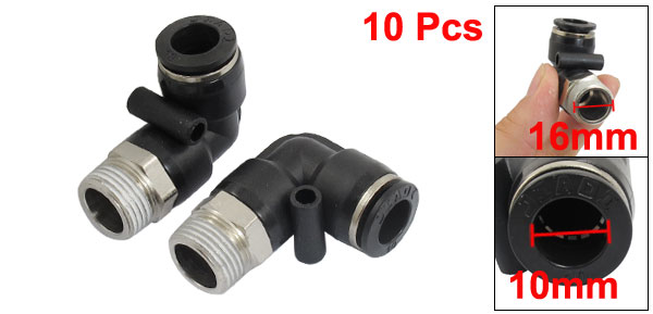 Product Name Quick Fittings Model JPL10-03 Design L Shaped (90 Degree Elbow) Material Plastic, Metal Thread Size 3/8" PT Thread Diameter 16mm Tube Diameter 10mm Total Size (Approx) 43 x 34 x 19mm/ 1.7" x 1.3" x 0.7" (L*W*H) Color Black Weight 268g Package Content 10 x Quick Fittings - Reviews