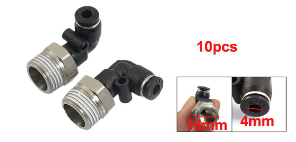 Product Name Quick Fittings Model JPL4-03 Design L Shaped (90 Degree Elbow) Material Plastic, Metal Thread Size 3/8" PT Thread Diameter 16mm Tube Diameter 4mm Total Size (Approx) 33 x 23 x 17mm/ 1.3" x 0.9" x 0.7" (L*W*H) Color Black Weight 189g Package Content 10 x Quick Fittings - Reviews