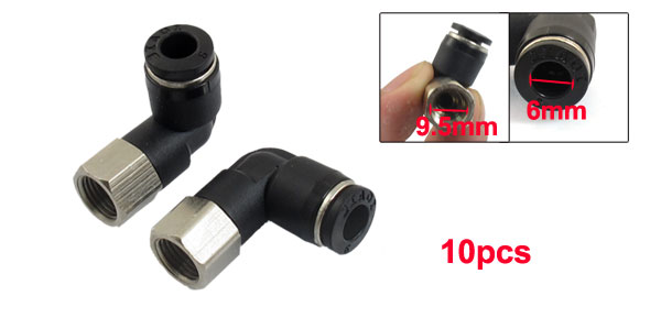 Product Name Quick Fittings Model JPLF6-01 Design L Shaped (90 Degree Elbow) Material Plastic, Metal Thread Size 1/8" PT Thread Diameter 9.5mm Tube Diameter 6mm Total Size (Approx) 29 x 25 x 13mm/ 1.1" x 1" x 0.5" (L*W*H) Color Black Weight 111g Package Content 10 x Quick Fittings - Reviews