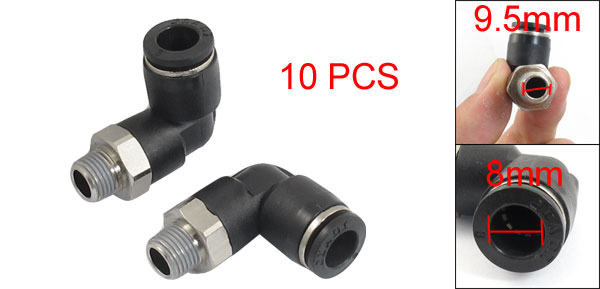 Product Name Quick Fittings Model JPL8-01 Design L Shaped (90 Degree Elbow) Material Plastic, Metal Thread Size 1/8" PT Thread Diameter 9.5mm Tube Diameter 8mm Total Size (Approx) 34 x 29 x 15mm/ 1.3" x 1.1" x 0.6" (L*W*H) Color Black Weight 156g Package Content 10 x Quick Fittings - Reviews