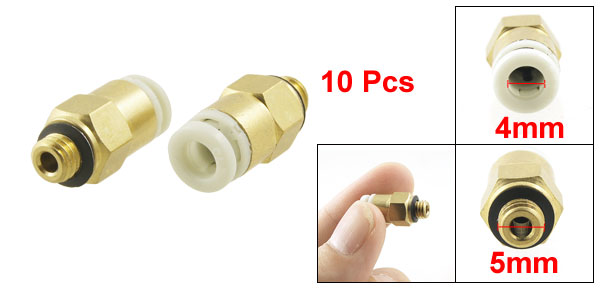 Item Name Push in to Connect Fitting Design Straight Male Connector Fit Tube Outside Diameter 4mm/5/32" Thread Diameter M5(5mm/1/5") Overall Size 18 x 8mm/ 0.7“ x 0.3" (L*Hex Size) Material Brass, Plastic Color Gold Tone, Gray Weight 27g Package Content 10 x Push in to Connect Fitting - Reviews