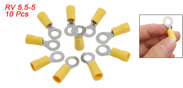 Product Name Pre Insulated Terminal Model RV 5.5-5 Design Ring Tongue Material PVC Plastic, Metal Color Silver Tone, Yellow Fit Cable Size 4- 6mm2 (A.W.G 12-10) Ring Diameter 5.3 x 9.5mm/ 0.2" x 0.37" (Inside Dia*Outside Dia) Screw Hole Diameter 4mm/ 0.15" Tube Inner Diameter 6mm/ 0.2'3 Total Length 26.5mm/ 1.04'' Max. Current 48A Weight 17g Package Content 10 x Pre Insulated Terminal - Reviews