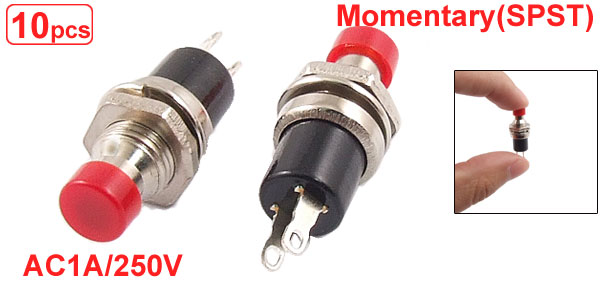 Item Name Push Button Switch Action Type Momentary Contact Type NO Poles SPST Rating Voltage AC 250V / 1A Terminals 2 Pin Thread Dia. 6.9mm / 0.27" Cap Dia. 6mm / 0.24" Pin Pitch 3mm / 0.11" Overall Size 25 x 9mm / 0.98" x 0.35" (Max. L * D) Material Plastic, Metal Color Red, Black Weight 39g Package Content 10 x Push Button Switch - Reviews