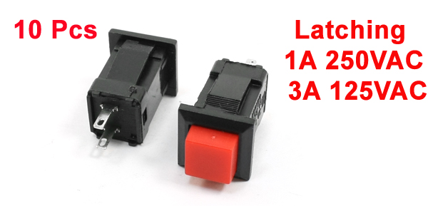 Product Name Push Button Switch Contact Type Latching (SPST) Working Current & Voltage 1A 250VAC 3A 125VAC Terminal Quantity 2 Mounting Size 11 x 11mm/0.43" x 0.43"(L*W) Total Size(Approx) 1.4 x 1.4 x 3.8cm/0.55" x 0.55" x 1.5"(L*W*H) External Material Metal, Plastic Color Red, Black Net Weight 28g Package Content 10 x Push Button Switch - Reviews