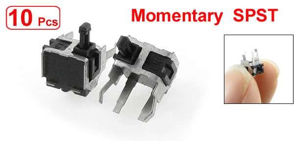 Product Name Detector Switch Model No. SPPB620300 Resistive Load(Max./ Min.) DC 30V 0.1A/ DC 3V 50µA Contact Resistance(Max.) 500m Ohm Type One-way Operation Type Action Momentary Contact, SPST Pin Number 2 Total Size 8 x 6 x 8mm/ 0.31" x 0.24" x 0.31" (L*W*H) Pin Length 3mm/ 0.12" Material Plastic, Metal, Electric Parts Color Black, Silver Tone Net Weight 2g Package Content 10 x Detector Switches - Reviews