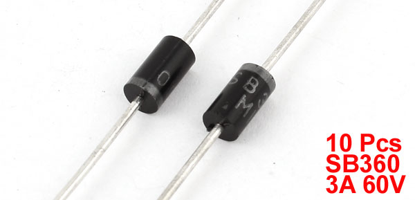 Product Name Rectifier Diodes Model SB360 Package Type DO-27 Maximum Repetitive Peak Reverse Voltage 60V Maximum Average Forward Rectified Current 3A Body Size 9 x 5mm / 0.35" x 0.2"(L*D) Length 60mm / 2.4" Color Black, Silver Tone Weight 10g Package Content 10 x Rectifier Diodes - Reviews