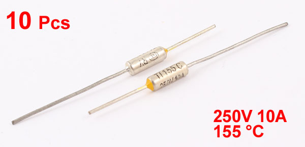 Product Name Thermal Fuse Rating 250V 10A Cutoff Temperature 155 °C Fuse Size 4 x 13 mm / 0.16" x 0.51" (D*L) Total Length 6.6cm / 2.6" Main Material Aluminum Fuse, Metal Leads Color Silver Tone Weight 11g Package 10 Pcs x Thermal Fuse - Reviews
