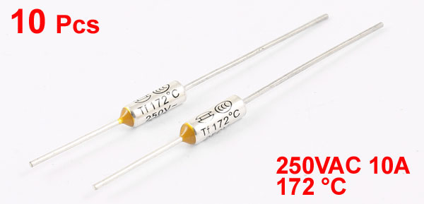 Product Name Thermal Fuse Rating 250VAC 10A Cutoff Temperature 172 °C Fuse Size 4 x 13 mm / 0.16" x 0.51" (D*L) Total Length 6.6cm / 2.6" Main Material Aluminum Fuse, Metal Leads Color Silver Tone Weight 11g Package 10 Pcs x Thermal Fuse - Reviews