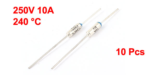 Product Name Thermal Fuse Rating 250V 10A Cutoff Temperature 240 °C Fuse Size 4 x 13 mm / 0.16" x 0.51" (D*L) Total Length 6.6cm / 2.6" Main Material Aluminum Fuse, Metal Leads Color Silver Tone Weight 11g Package 10 Pcs x Thermal Fuse - Reviews