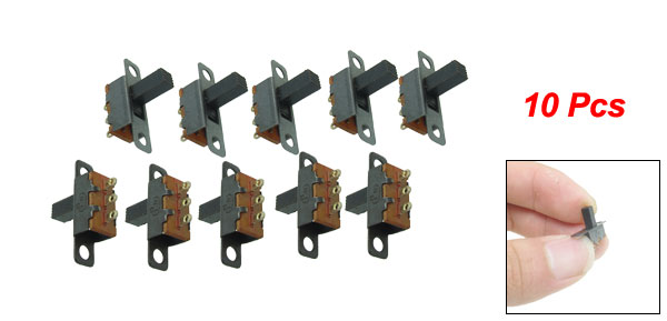 Details10 Pcs Single Row 3 Pins 2 Positions SPDT On/On Mini Slide Switch  Product Name Slide Switch Position 2 Pins Design Single Row 3 Pins Contact Type SPDT Pins Pitch 2mm/ 0.08" Rating DC 50V, 0.5A Contacts Resistance 30MΩ Insulation Resistance 100MΩ Minimum Load DC 500V Dielectric Strengths AC 500V / 1 minute Life Test 10000 cycles/ minute Overall Size 18 x 5 x 15mm/ 0.7" x 0.2" x 0.6" (L*W*H) Material Plastic & Metal Color Black Weight 9g Package 10 x Horizontal Slide Switch
