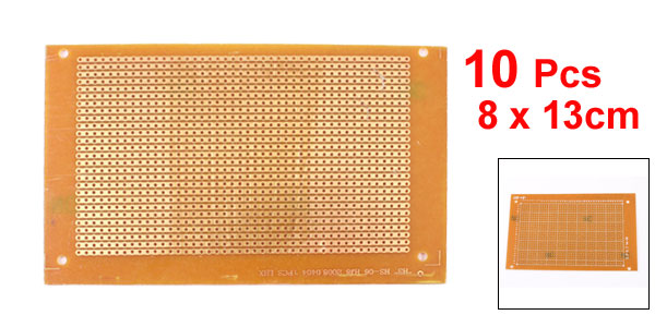 Product Name Universal PCB Board Hole Pitch 2.54mm Total Size 8 x 13cm/3.1" x 5.1"(L*W) Mounting Hole Dia. 1mm/0.039" Thickness 1.2mm/0.047" Materials PCB, Plastic, Glass Fiber Main Color Brown Weight 157g Package Content 10Pcs x Universal PCB Board - Reviews