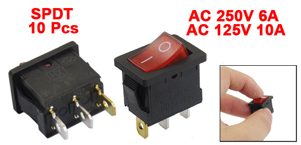 Product Name Rocker Switch Poles SPDT Terminals 3 Pins Position On/Off Two Position Rated Voltage AC 250V 6A AC 125V 10A Overall Size 2.1 x 1.4 x 2.7cm / 0.82" x 0.55" x 1.06" (L*W*H) Mounting Size 2.1 x 1.2 cm / 0.82" x 0.47" (L*W) Pin Spacing 7.2mm/0.28" Color Black, Red Material Plastic, Metal Total Weight 46g Package Content 10 x Rocker Switches - Reviews