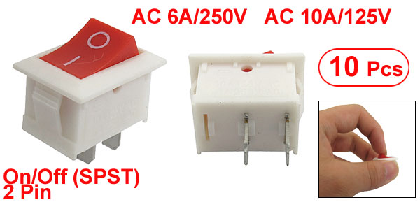Item Name Rocker Switch Type On/Off (SPST) Terminals 2 Pin Voltage & Current AC 6A/250V, AC 10A/125V Overall Size ~21 x 15 x 25mm / 0.8" x 0.6" x 1"(L*W*T) Mounting Hole Size 18.3 x 11.9mm / 0.7" x 0.47"(L*W) Color White, Red Material Plastic & Metal Total Net Weight 30g Package Content 10 x Rocker Switch - Reviews