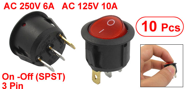 10 Pcs SPST Red Neon Light On/Off Round Rocker Switch AC 6A/250V 10A/125V Cxmdg