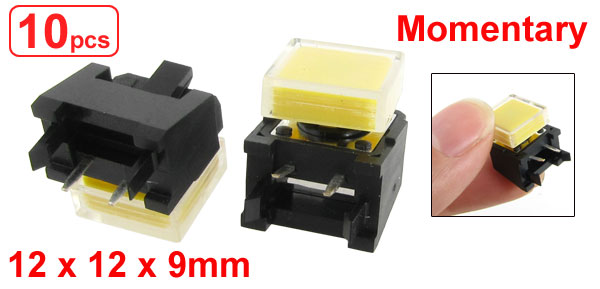Product Name Tact Switch Contact Type Momentary Contact Dimension 12 x 12 x 9mm / 0.47" x 0.47" x 0.35" (L*W*H) Button Size 12 x 12mm / 0.47" x 0.47"(L*W) Total Size 18 x 13 x 15mm / 0.7" x 0.51" x 0.59" (L*W*H) Pin Pitch 5mm / 0.19" Pin Length 4mm / 0.16" Material Plastic, Metal, Electric Parts Color Black, Silver Tone, Yellow, Clear Net Weight 17g Package Content 10 Pcs x Tact Switches - Reviews