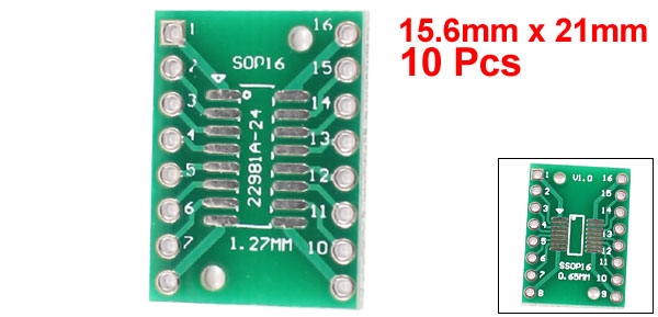 Product Name Adapter Plate Type SSOP16 to SOP16 Pin Number(Each Side) 16 Pin Pitch 0.65mm/0.026",1.27mm/0.05" Fixing Hole Dia 1.5mm/0.06" Body Size 15.6 x 21mm/0.61" x 0.83"(L*W) Material Plastic, Electronic Part Main Color Green Net Weight 12g Package Content 10Pcs x Adapter Plate - Reviews