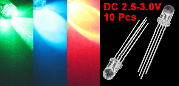 Details10 Pcs Tri-Color 5mm 4Pins Common Anode Red Green Blue LED Light Emitting Diodes  Product Name Light Emitting Diode Material Metal, Plastic Emitting Light Color Red,Green,Blue Voltage DC 2.5-3.0V Head Size(Approx) 8.5 x 5mm/ 0.33" x 0.2"(L*D) Pin Size (Approx.) 0.5 x 24mm / 0.02" x 0.94" (D * Max.L)