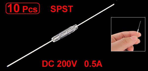 Product Name Reed Switch Model TS-560 Contact Type SPST (Form A) Max. Contact Rating 10W Max. Switching Voltage DC 200V Max. Switching Current 0.5A Max. Carry Current 1.5A Max. Initial Contact Resistance 150mΩ Min. Insulation Resistance 10Ω Operate time 0.5ms Bounce time 0.4ms Release time 0.2ms Max. Operating Frequency 500Hz Pull in Value 15-20AT Glass Tube Size (Approx.) 2 x 14mm/ 0.078" x 0.55"(D*L) Lead Terminal Size(Approx.) 0.4 x 20.5mm/ 0.016" x 0.807"(D*L)(Each Side) Total Length (Approx.) 63mm/ 2.48" Color Silver Tone, Clear Weight 3g Package Content 10 x Reed Switch - Reviews