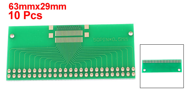 Product Name PCB Adapter Board Pin Number 50 Pin Pitch 0.5mm Total Size 63 x 29mm/2.5" x 1.1"(L*W) Mounting Hole Dia. 1.5mm/0.06" Thickness 1mm/0.04" Materials PCB, Tin Plated, Glass Fiber Main Color Green Weight 37g Package Content 10Pcs x PCB Adapter Board - Reviews