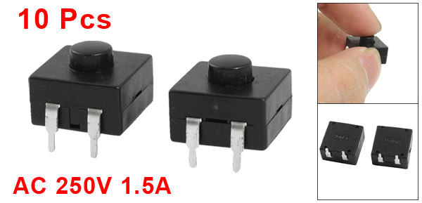 Product Name Torch Push Button Switch Contact Type Latching Contact Voltage/ Current AC 250V 1.5A Pin Number 2(Single Row) Terminal Driection Vertical Overall Size 12 x 12 x 9mm/ 0.5" x 0.5" x 0.35" (L*W*H) Button Diameter 5mm/ 0.2" Material Plastic, Metal, Electric Parts Color Black, Silver Tone Weight 12g Package Content 10 x Torch Push Button Switch - Reviews