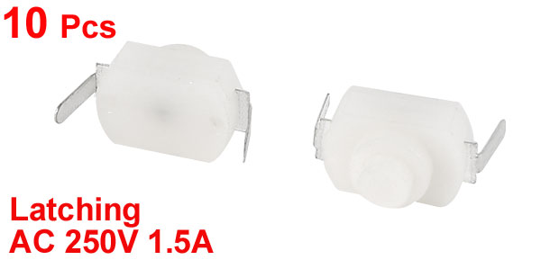 Product Name Torch Push Button Switch Contact Type Latching Contact Voltage/ Current AC 250V 1.5A Pin Number 2 Terminal Driection Vertical Pin Size 6 x 2mm/ 0.24" x 0.08" (L*W) Overall Size 12 x 8 x 8mm/ 0.5" x 0.3" x 0.3" (L*W*H) Material Plastic, Metal, Electric Parts Color White, Silver Tone Weight 8g Package Content 10 x Torch Push Button Switch - Reviews