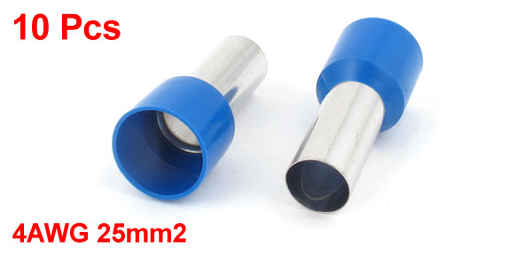 Product Name Insulated Ferrule Model E25-16 Design Tube Type Material Plastic, Tin Plated Copper Color Silver Tone, Blue Fit Wire Gauge 4AWG 25mm2 Copper Tube Size 7.5 x 8 x 16mm / 0.29" x 0.31" x 0.63" (Inner Dia*OD*L) Plastic Part Size 10 x 12 x 12mm / 0.4" x 0.47" x 0.47" (Inner Dia*OD*L) Total Length 28mm / 1.1" Net Weight 10g Package Content 10 Pcs x Insulated Ferrules - Reviews