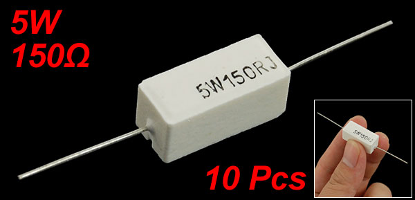 Product Name Cement Resistor Body Material Cement Power 5W Resistance 150Ω Tolerance ±5% Body Size (Approx.) 22 x 10 x 9mm/ 0.87" x 0.39" x 0.35" (L*W*H) Lead Diameter (Approx.) 0.8mm/ 0.031" Lead Length (Approx.) 25mm/ 0.98"(Max.), 18mm/ 0.7" (Min.) Color White Weight 44g Package Content 10 x Cement Resistors - Reviews