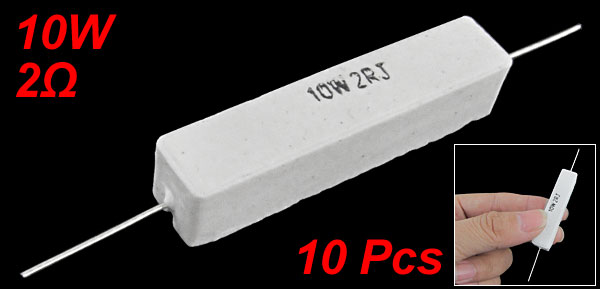 Product Name Cement Resistor Body Material Ceramic, Cement Power 10W Resistance 2Ω Tolerance ±5% Body Size (Approx.) 49 x 10 x 9mm/ 1.9" x 0.39" x 0.35" (L*W*H) Lead Diameter (Approx.) 0.8mm/ 0.031" Lead Length (Approx.) 23mm/ 0.9"(Max.), 19mm/ 0.15" (Min.) Color White Weight 114g Package Content 10 x Cement Resistors - Reviews
