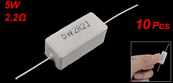 Product Name Cement Resistor Body Material Cement Power 5W Resistance 2.2Ω Tolerance ±5% Body Size (Approx.) 22 x 10 x 9mm/ 0.87" x 0.39" x 0.35" (L*W*H) Lead Diameter (Approx.) 0.8mm/ 0.031" Lead Length (Approx.) 23mm/ 0.9"(Max.), 18mm/ 0.7" (Min.) Color White Weight 46g Package Content 10 x Cement Resistors - Reviews