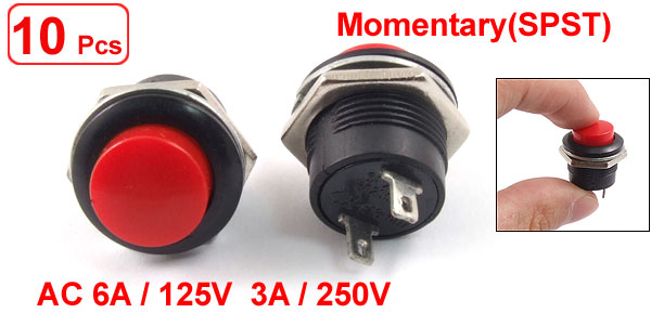 Product Name Push Button Switch Action Type Momentary Contact Type NO Poles SPST Rating Voltage AC 6A / 125V, 3A / 250V Terminals Quantity 2 Pins Thread Dia. 16mm / 0.63" Button Dia. 12.5mm / 0.49" Terminals Pitch 7.5mm / 0.3" Overall Size 23 x 21mm / 0.9" x 0.8"(Max. L * D) Material Plastic & Metal Color Red & Black Weight 55g Package Content 10 x Push Button Switch - Reviews