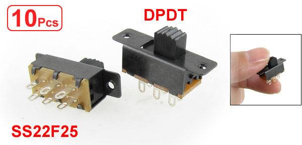 Product Name Slide Switch Model SS-22F25G5 Action Type DPDT Power DC 50V 0.5A Terminal Quantity 6 Terminal Length 4mm/ 0.16" Contact Resistance 30mΩ Max Insulation Resistance 100mΩ Min at 500V DC Withstand Voltage AC 500V for 1 min Overall Size 23 x 7 x 16mm/ 0.9" x 0.28" x 0.63"(L*W*H) Knob Size 5 x 3.5 x 5mm/ 0.2" x 0.14" x 0.2"(L*W*H) Material(External) Plastic, Metal Main Color Silver Tone, Black Weight 20g Package Content 10 x Slide Switch - Reviews