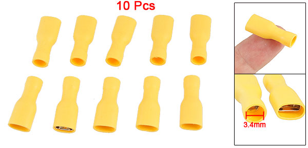 Product Name Crimp Terminals Model NO. FDFD 5-250 Type Female Spade Connector Shell Color Yellow Shell Tail Hole Diameter 5.7mm/ 0.22" Inner Spade Width 7.4mm/ 0.3" Spade Tail Hole Diameter 3.4mm/ 0.13" Fit Cable Size 4 - 6mm2 ( A.W.G 12-10) Max Rating Current 24A Each Size 24 x 9.6 x 7mm/ 0.94" x 0.38" x 0.28" (L*W*T) Material Plastic & Metal Weight 12g Package 10 x Female Crimp Terminals - Reviews