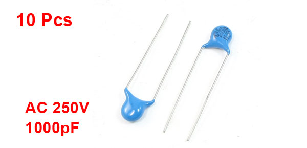 Product Name Ceramic Disc Capacitors Rated Voltage AC 250V Capacitance 1000PF Body Size 7 x 4mm/ 0.27" x 0.15" (D*T) Lead Space 7mm/ 0.2" Lead Length 26mm/ 1" Main Color Blue, Silver Tone Weight 10g Package Content 10 Pcs x Ceramic Disc Capacitors - Reviews