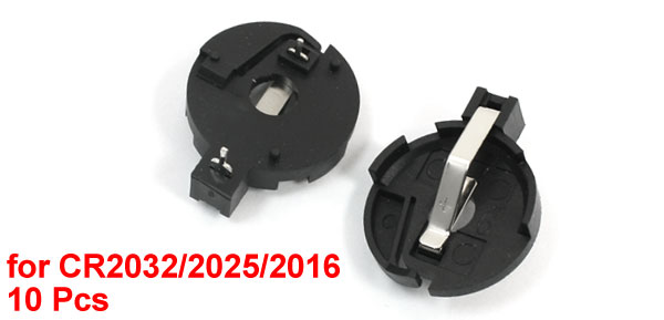 Details10 Pieces Coin Cell Button Battery Holder Socket Connector for CR2016/2025/2032  Product Name Button Battery Holder Fit Battery Model for CR2032/2025/2016 Battery (Not Included Here) Material Plastic, Metal Body Size 28 x 23 x 1.2mm/ 1.1" x 0.9" x 0.47"(L*D*T) Inner Diameter 20mm / 0.79" Pin Quantity 2(1 for "-", 1 for "+") Distance Between Pins 20mm / 0.79" Color Black Net Weight 20g Package Content 10 Pcs x Button Battery Holder