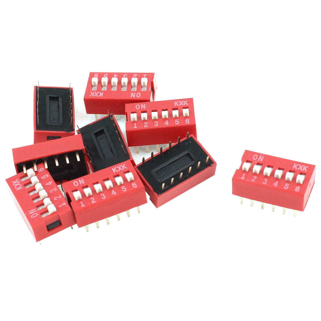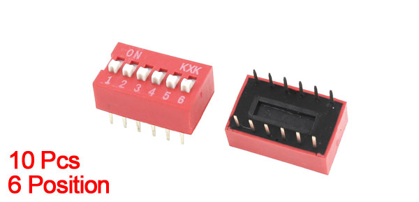 Product Name DIP Switch Type Slide Type Poles 6 Position 12Pin (2Row) Pitch 2.54mm Non-Switching Rating 100mA DC 50V Switching Rating 100mA DC 24V Dimension 17 x 10 x 10mm/ 0.67" x 0.39" x 0.39"(L*W*H) Material Plastic, Electric Parts Main Color Red, Gold Tone,White Weight 16g Package Content 10 Pcs x DIP Switches - Reviews