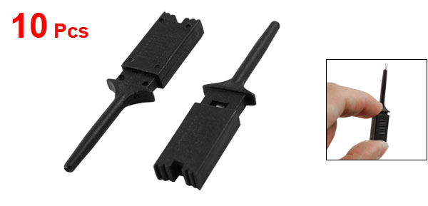 Product Name Test Hook Clip Each Size 48 x 13 x 5mm/1.9'' x 0.5'' x 0.2''(L*W*H) End Hole Dia. 2.5mm/0.1'' Hook Size 4.5 x 2mm/0.18'' x 0.08''(L*W) Color Black Material Metal, Plastic Total Weight 12g Package 10 x Test Hook Clips - Reviews