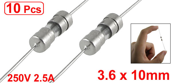 Product Name Axial Fuse Type Slow Blow Rated Power 250V, 2.5A Body Size 3.6 x 10mm/0.1'' x 0.4''(D*L) Leads Size(Each End) 5 x 28mm/0.2'' x 1.1'' (D*L) Color Silver Tone Material Alloy, Glass Weight 6g Package 10 x Axial Fuse - Reviews