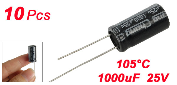 Product Name Aluminum Electrolytic Capacitor Type Radial Lead Maximum Temperature 105°C Voltage 25V Capacitance 1000uF Capacitance Tolerance ±20% Body Size 10 x 20mm/ 0.39'' x 0.78'' (D*L) Lead Spacing 4mm/ 0.16'' Lead Length 27mm/ 1.06'', 21mm/ 0.82'' External Material Aluminum Weight 25g Color As Picture Shown Package Content 10 x Electrolytic Capacitors - Reviews