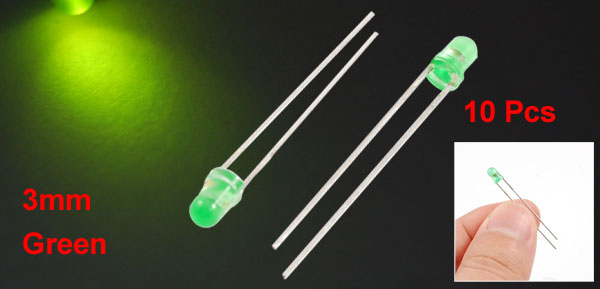 Product Name Emitting Diode LED Material Metal, Platic Diameter 3mm Light Color Green Size(Approx) 3.4 x 0.3cm / 1.3" x 0.12"(L*D) Weight 2g Package Content 10 x Green Light Diode LED - Reviews