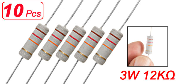 Details10 x 3W 500V 12K ohm 12KR Metal Oxide Film Resistors  Product Name Metal Oxide Film Resistors Features Axial Lead Power Rating 3 W Resistance Value 12KΩ Tolerance ± 5% Withstang Voltage 500V Lead Size (Each End) 31 x 0.43mm / 1.2" x 0.016" (L * D) Body Size (Approx.) 15 x 5mm / 0.59" x 0.19" (L * D) Color As Picture Show Weight 16g Package Content 10 x Metal Oxide Film Resistors