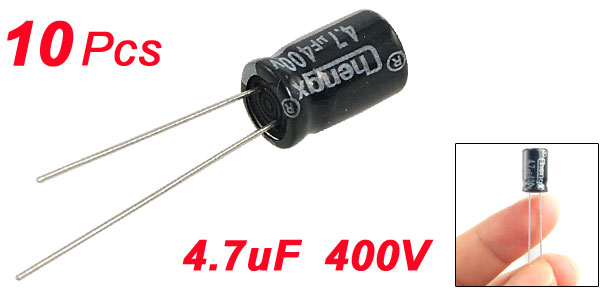 Product Name Aluminum Electrolytic Capacitor Type Radial Lead Maximum Temperature 105°C Withstand Voltage 400V Capacitance 4.7uF Capacitance Tolerance ±20% Body Size 8 x 12mm / 0.31'' x 0.47'' (D*L) Lead Spacing 3mm / 0.12'' Lead Length 27mm / 1.06'', 21mm / 0.83'' External Material Aluminum Weight 10g Color As Picture Shown Package Content 10 Pcs x Electrolytic Capacitors - Reviews