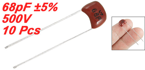 Product Name Mica Capacitor Dielectric Material Mica Capacitance 68pF Tolerance ±5% Withstand Voltage 500V Body Dimension 9 x 8 x 3mm/0.35" x 0.3" x 0.01"(W*H*T) Lead Length 28mm/1.1" Lead Pitch 7mm/0.27" Color As Picture Shown Net Weight 6g Package Content 10 x Mica Capacitors - Reviews