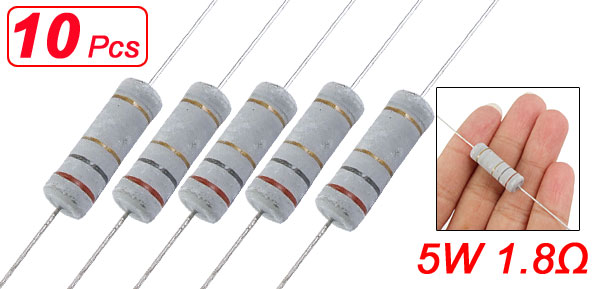 Product Name Metal Oxide Film Resistor Features Axial Lead Power Rating 5W Resistance Tolerance ± 5% Withstand Voltage 700V Resistance 1.8Ω Lead Size (Each End) 30 x 0.5mm / 1.18" x 0.019" (L*D) Body Size 24 x 7.3mm / 0.94" x 0.287" (L*D) Color As Picture Show Weight 37g Package Content 10 x Metal Film Resistors - Reviews
