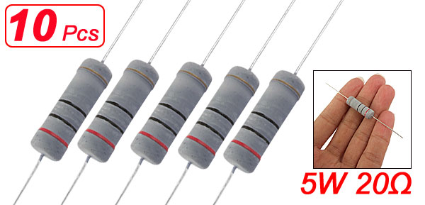 Product Name Metal Oxide Film Resistor Features Axial Lead Power Rating 5W Resistance Tolerance ± 5% Withstand Voltage 700V Resistance 20Ω Lead Size (Each End) 30 x 0.5mm / 1.18" x 0.019" (L*D) Body Size 24 x 7.3mm / 0.94" x 0.287" (L*D) Color As Picture Show Weight 37g Package Content 10 x Metal Film Resistors - Reviews